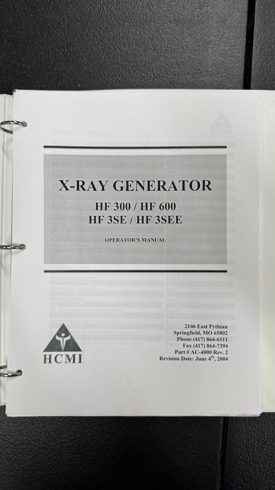 HCMI X-RAY GENERATOR OPERATOR MANUAL FOR HF 300 / HF 600 / HF 3SE / HF 3SEE MODELS, PART AC-4000 REV. 2. Please review all images carefully, we'll be happy to answer any questions you may have before purchasing.
